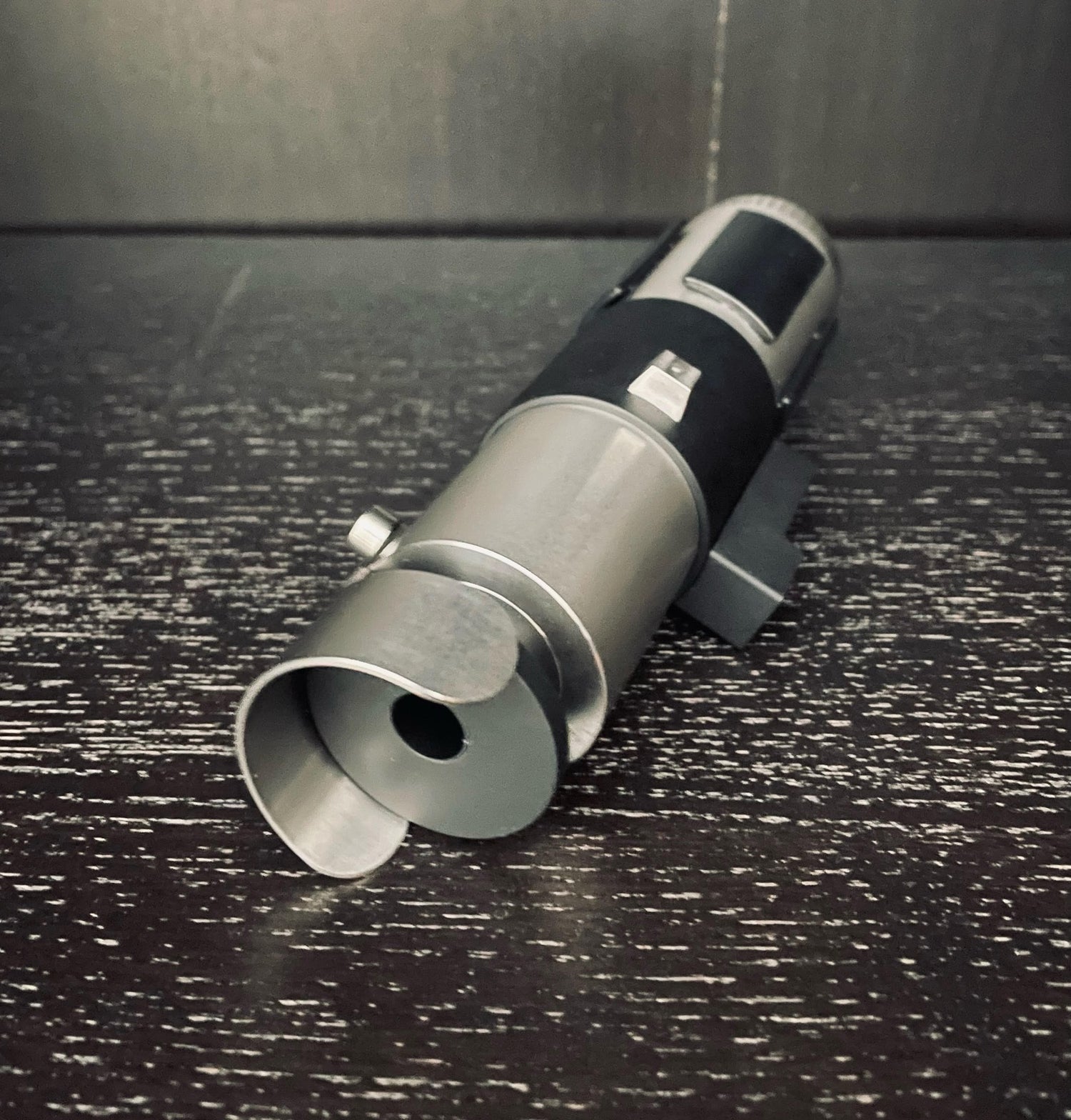 In an effort to get more accurate and closer to the source prop compared to my V1 I wanted to make a V2. Since the release of the film had already come and we had much better photos and details of the original props, this design was done to be more accurate from size and details to the original hero prop. This particular saber was painted by our partners at Sanotized Creations.
